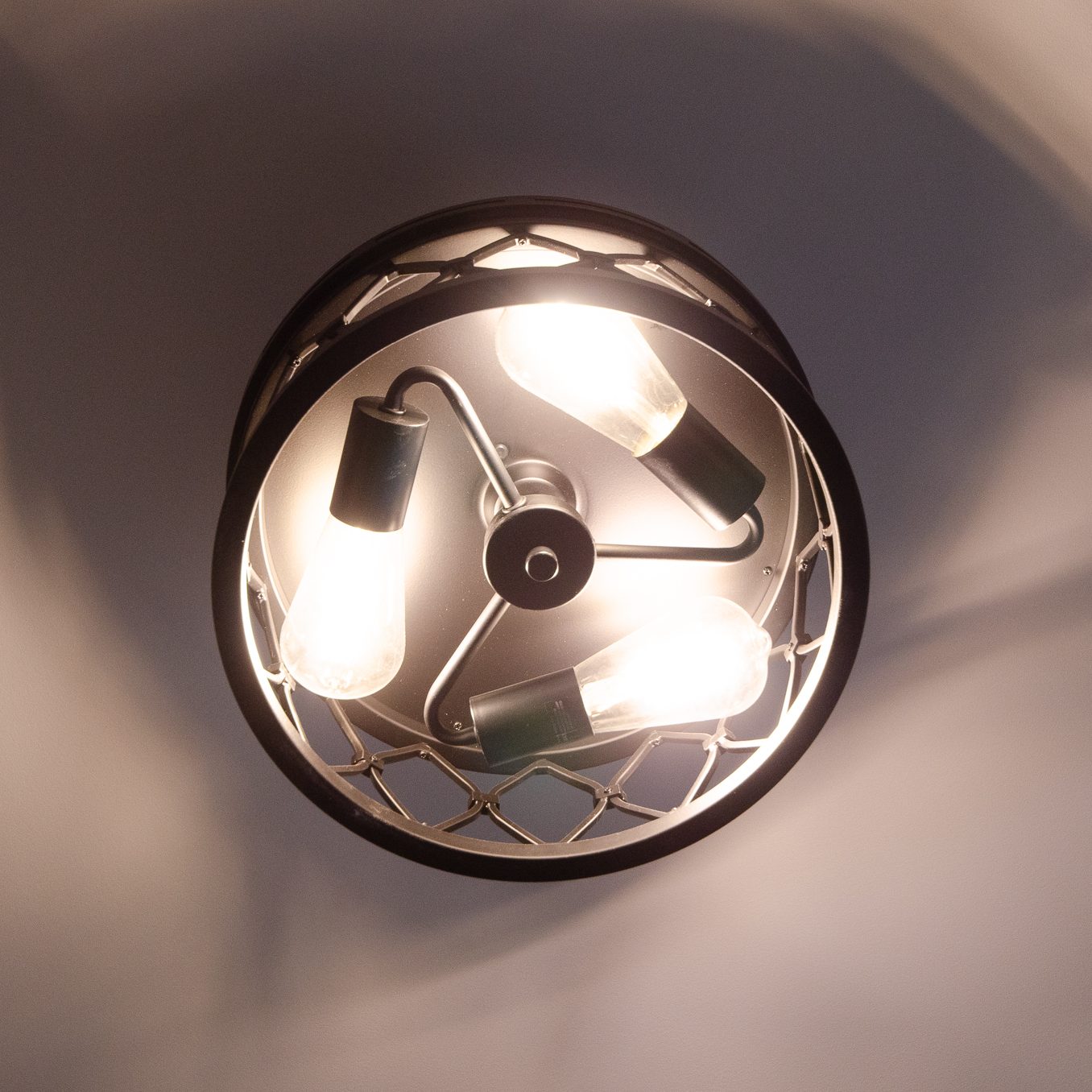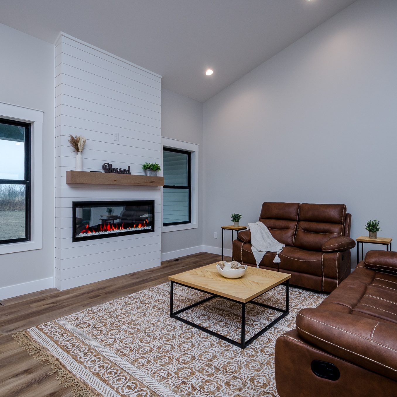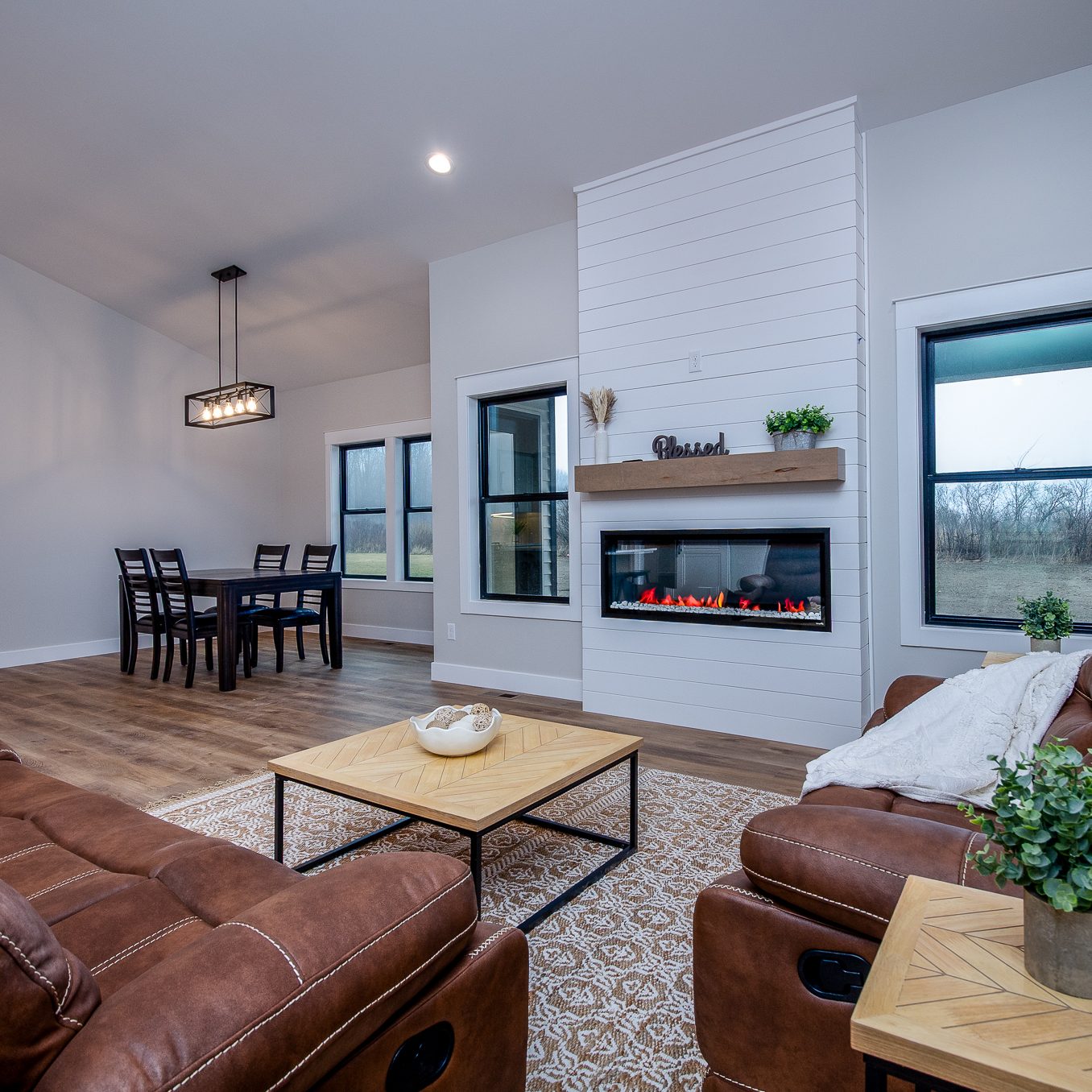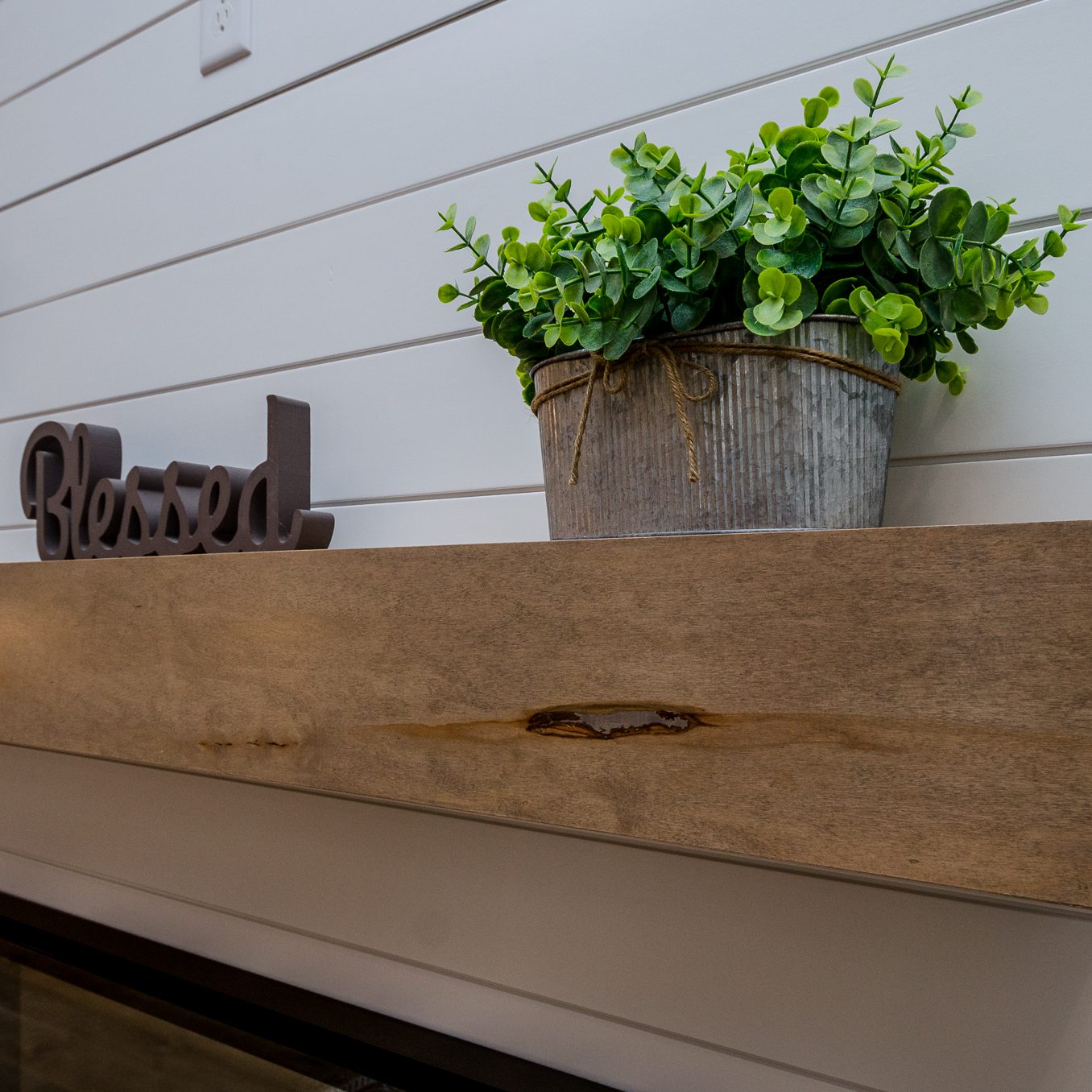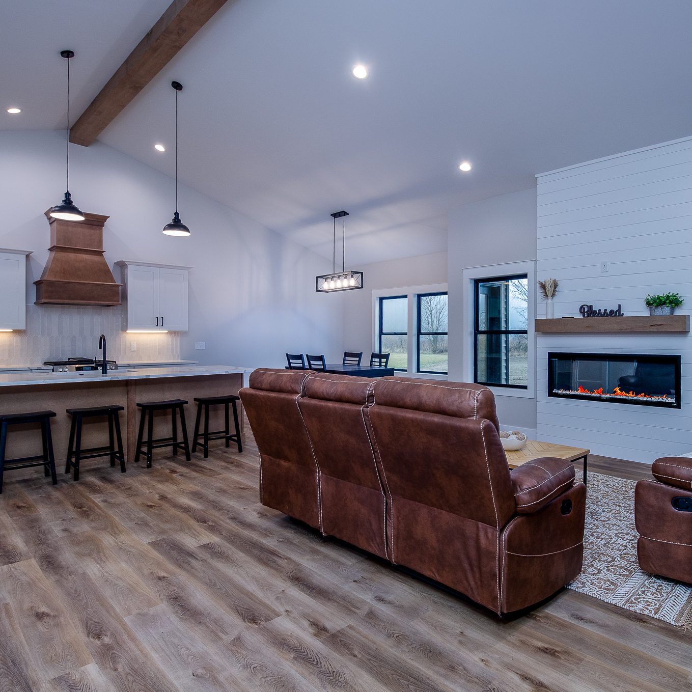Open-concept living area with farmhouse shiplap fireplace, open basement staircase, and rustic ceiling beam