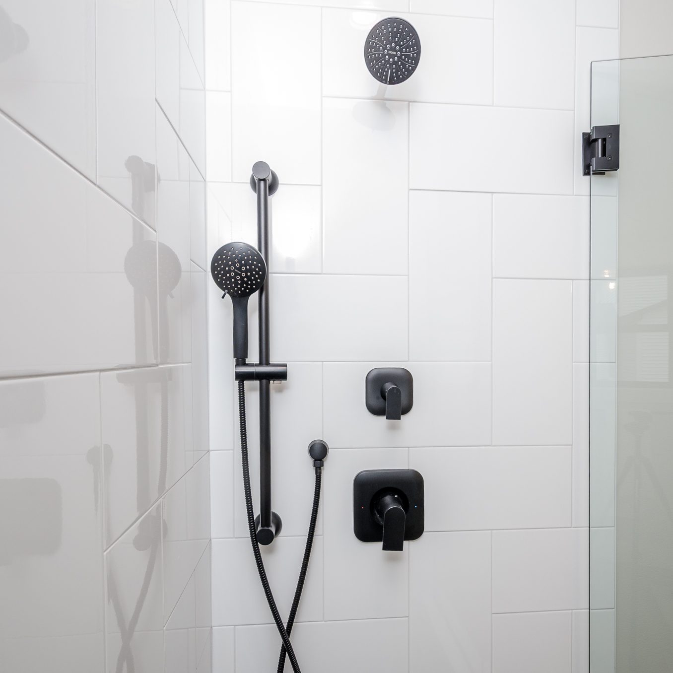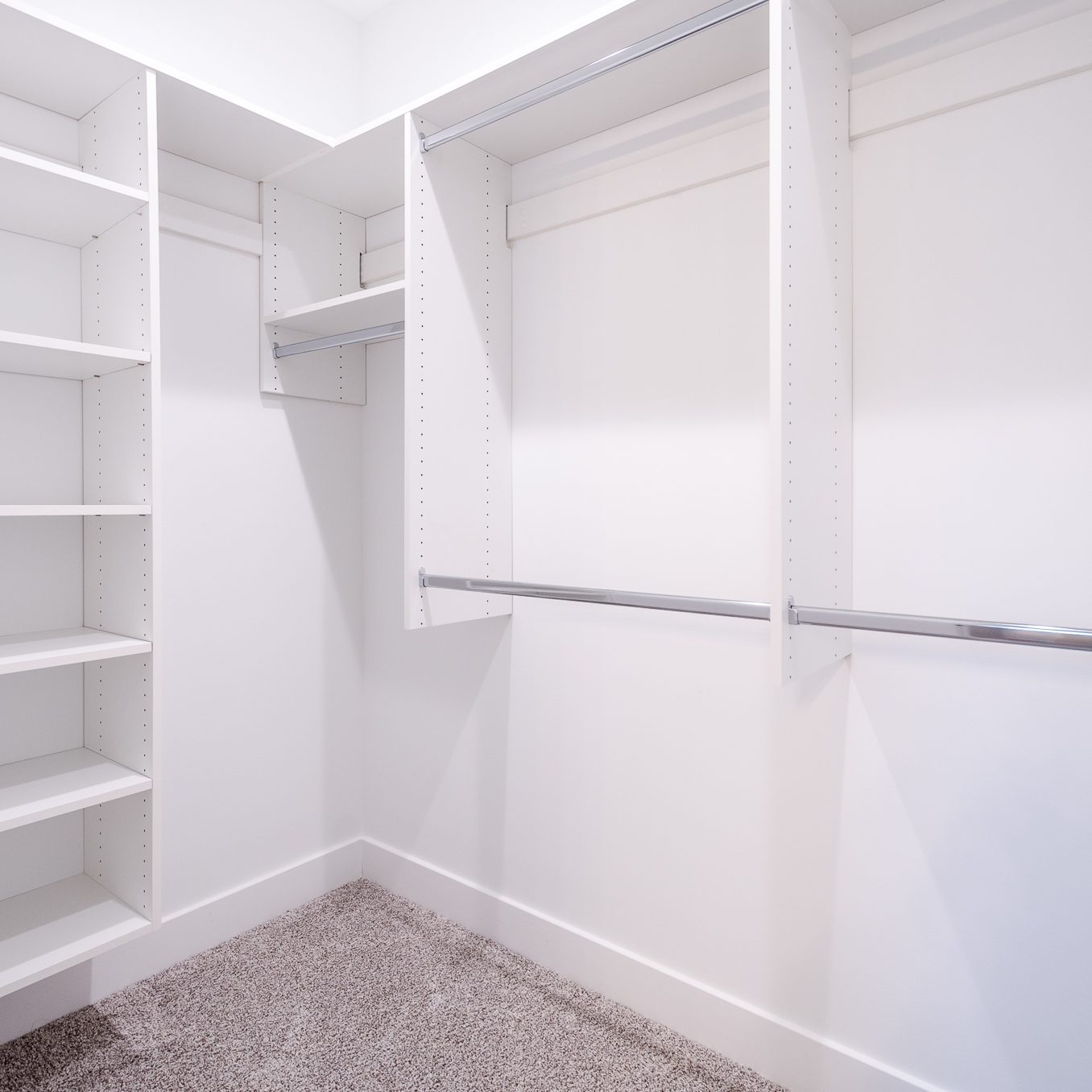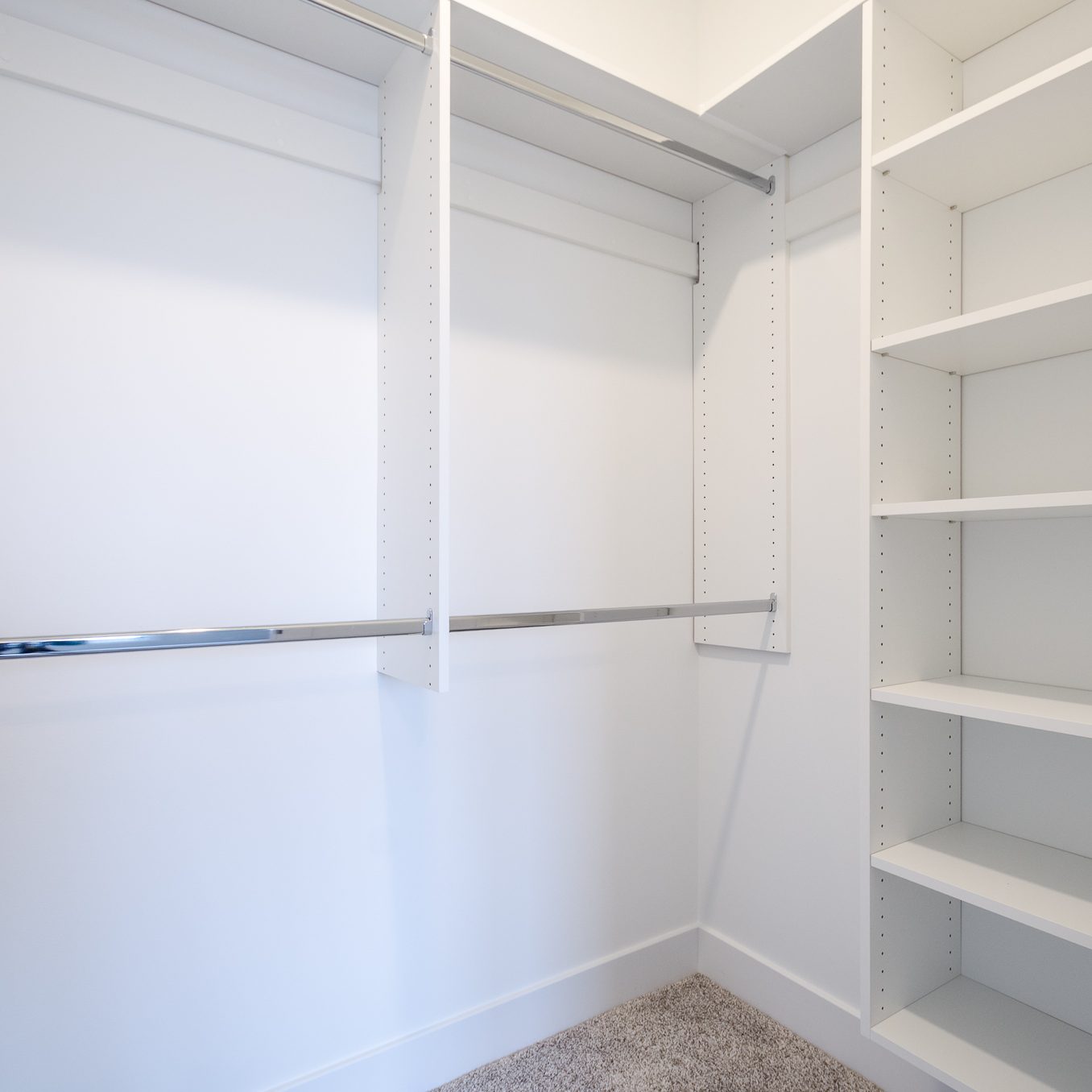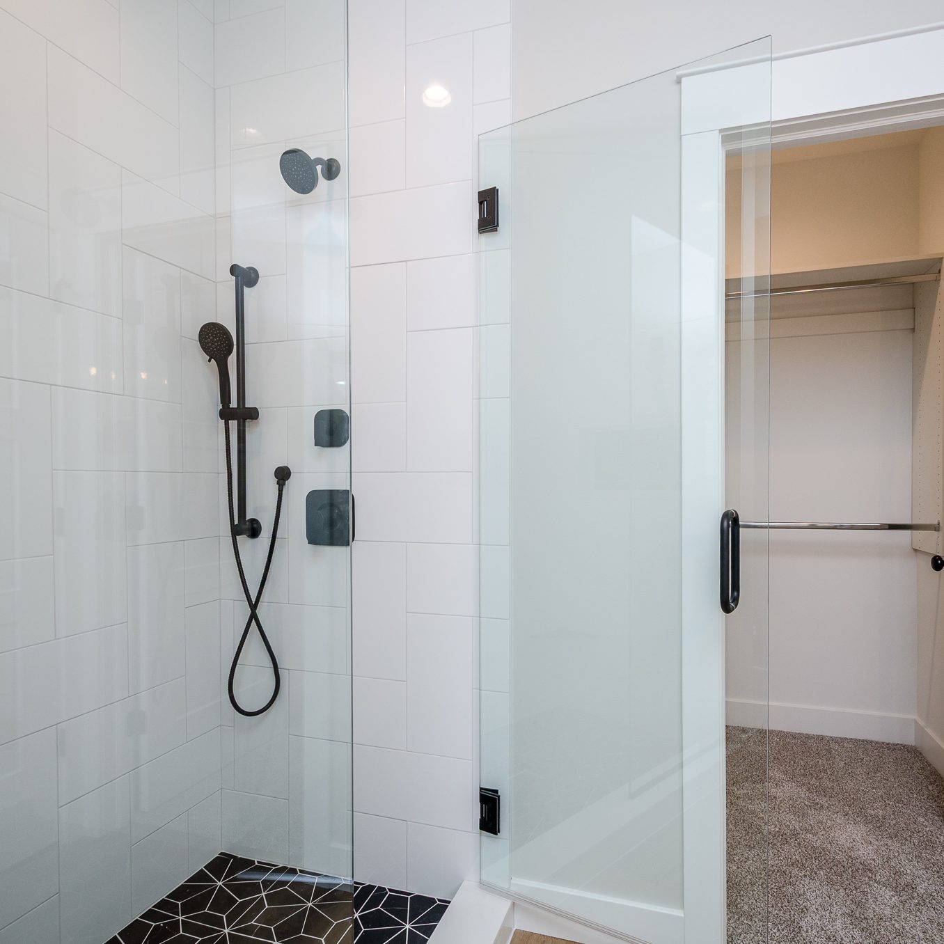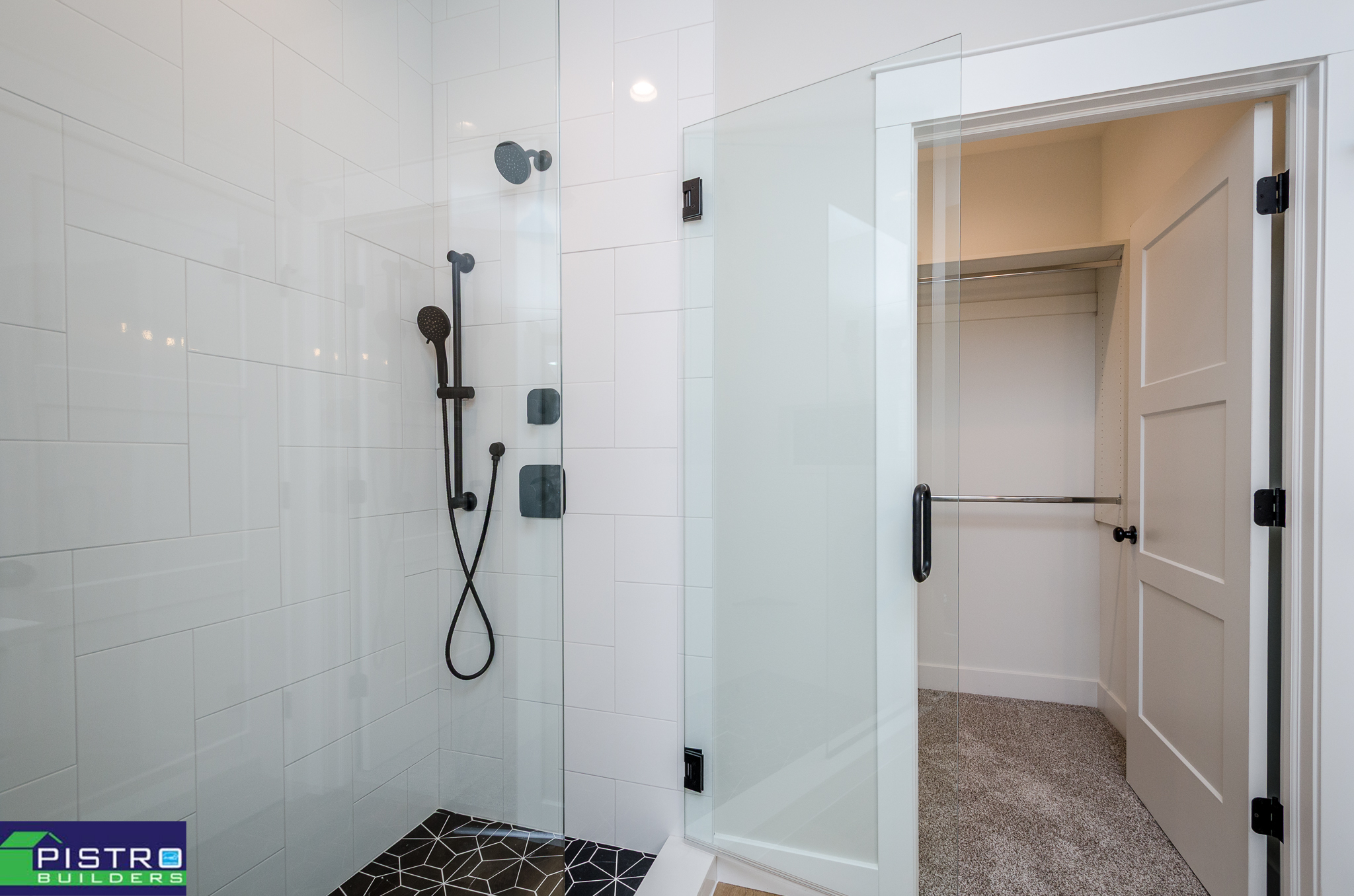 Spacious master suite with custom walk-in closet and tiled shower featuring a euro glass door